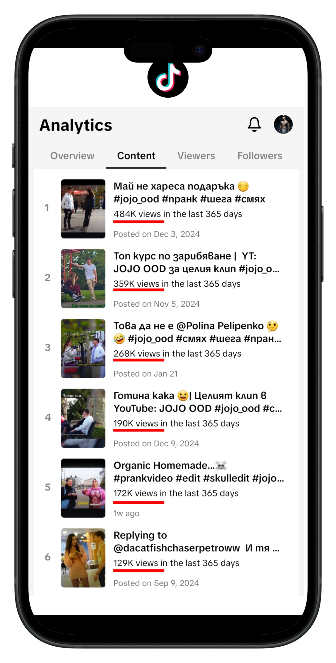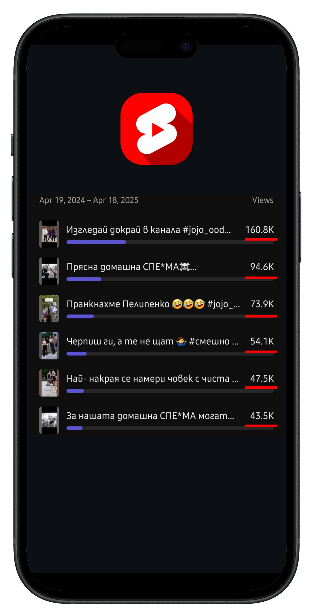 I run a prank channel where all these numbers came from simply clipping the best moments from my long-form YouTube videos.This has led to more brand recognition and more traffic to my long-form content.And all of this content was in Bulgarian — a language spoken by only 5 million people. Imagine what we can do for your English-speaking brand!